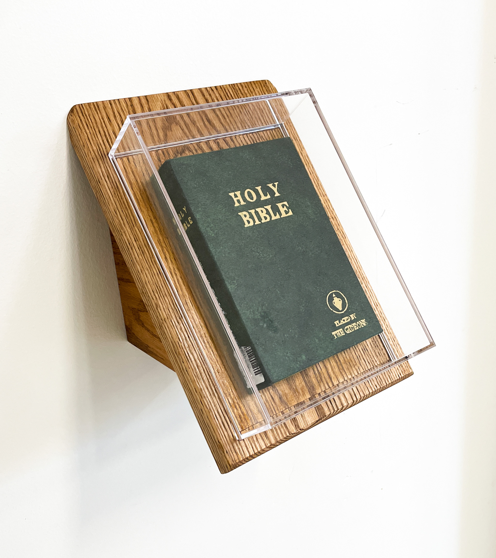 Holy Bible [Placed by the Gideons], 14 in. x 10 in. x 7 in., Mixed Media on Canvas / Wood / Plexiglass, 2023